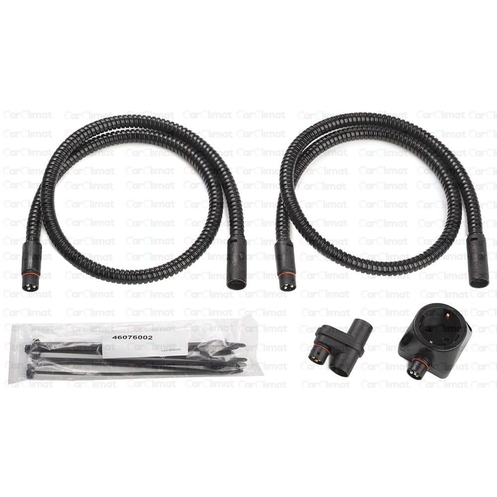 Cable set with DEFA internal socket, manufacturer number 460762 consists of a braided harness, a DEFA Plug at one end, a DEFA MiniPlug with a shield at the other end, and an electric ground cable. The MiniPlug is for internal use under the car body. The cable is compatible with most new cars.